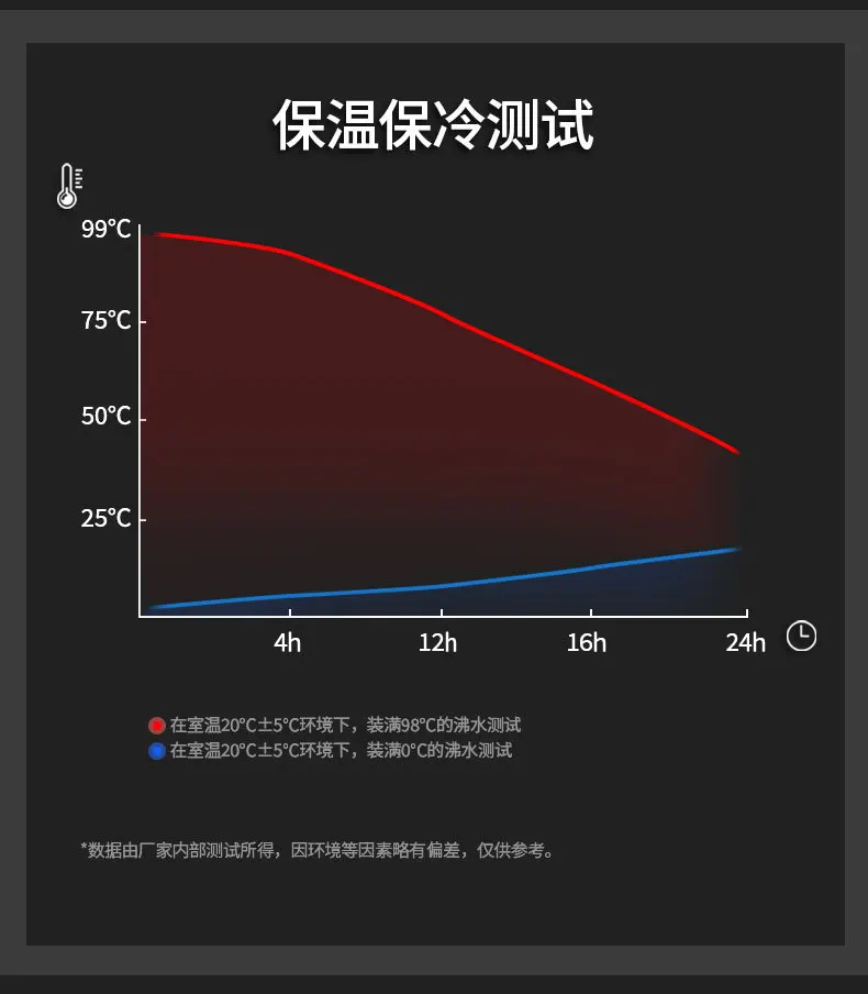 Keeps boiling water above 65°C after 12 hours and ice water below 10°C after 24 hours. Real tests show 80°C after 18 hours in -5°C winter camping.